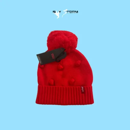 Levi’s Women’s Red Knit Pom-Pom Beanie – Textured Dot Detail Winter Hat
