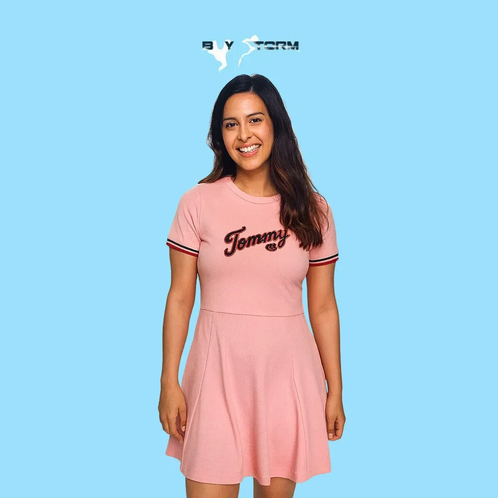 Brighten up her wardrobe with this adorable girls’ casual pink dress, featuring a sporty “Tommy 85” chest graphic and ribbed short sleeves with stripe detail. Made from soft, breathable fabric, this flared dress offers all-day comfort and easy movement—perfect for playdates, school, or casual outings with a stylish flair.